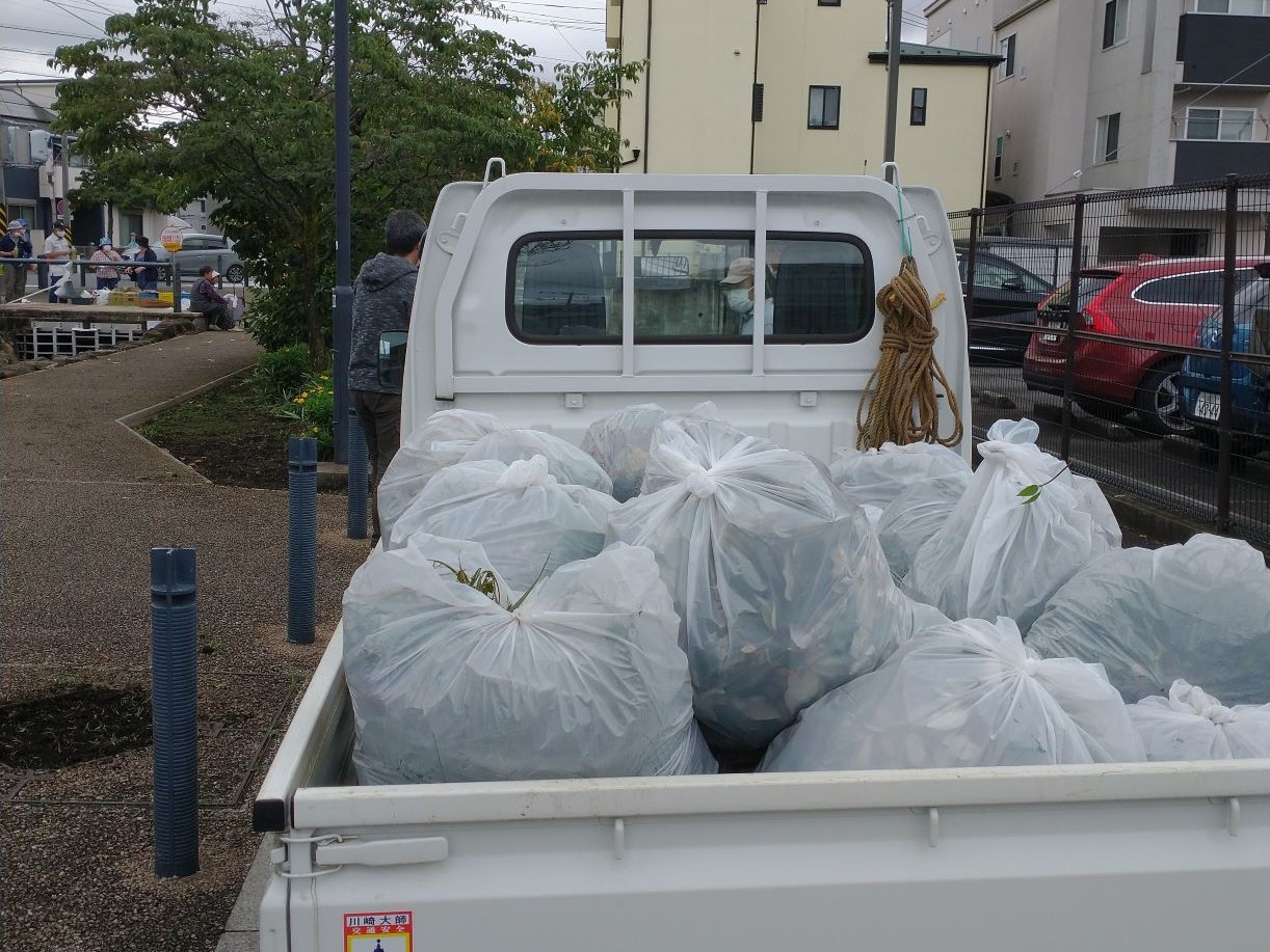 軽トラの荷台には、草でパンパンの袋が山積みに!
