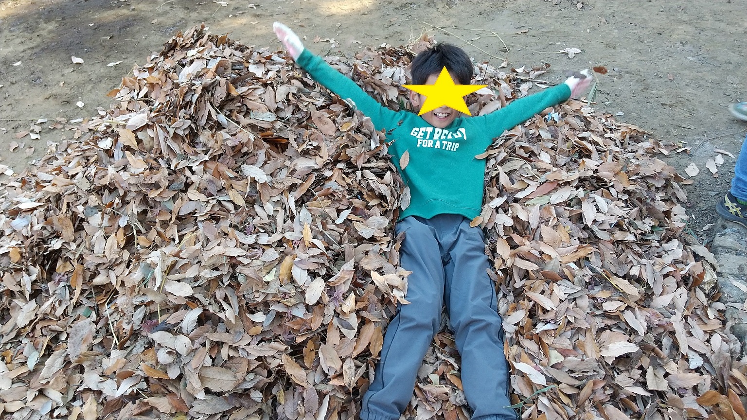 集めた落ち葉の上へダイブ!