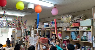 紙吹雪やシールを風船にいれる作業は支援員さんだけでなく、