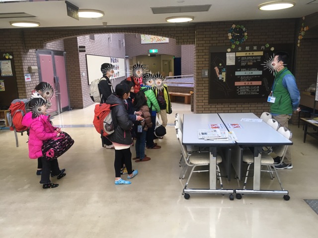 風の勢いに押されながらも一所懸命自転車を漕ぎ皆で出口へ向かいます。
