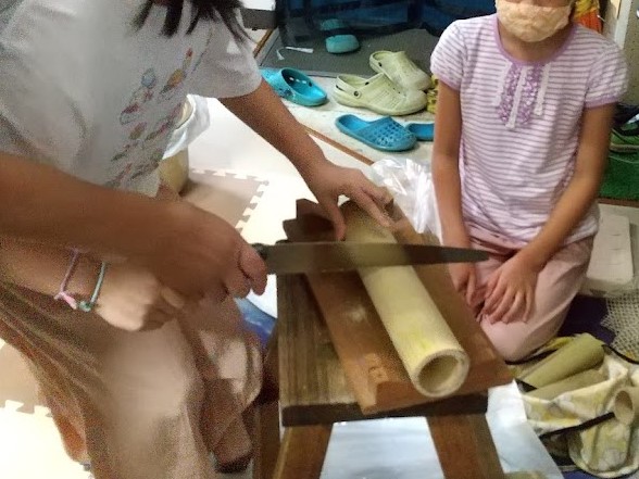 自分が思う長さにさらに調整。中には、初めてのこぎりを使う子もいます。